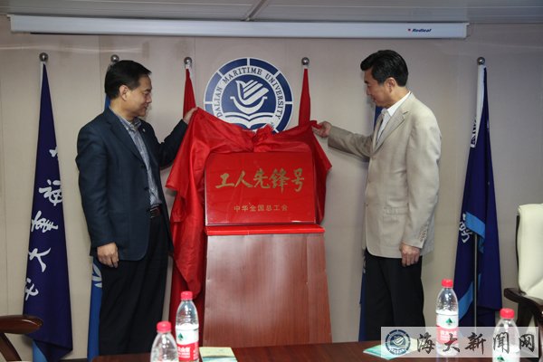 5月11日上午,大连海事大学举行教学实习船“育鲲”轮“全国工人先锋号”揭牌仪式,大连市总工会副主席韩晓秋,教育工会主席于波,大连海事大学纪委书记李信标、工会主席刘志华以及大连各高校工会负责人参加揭牌仪式并交流座谈。